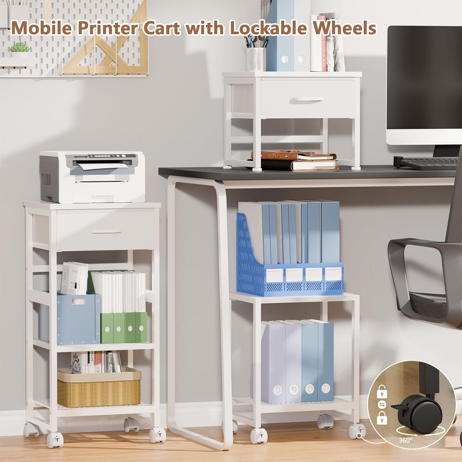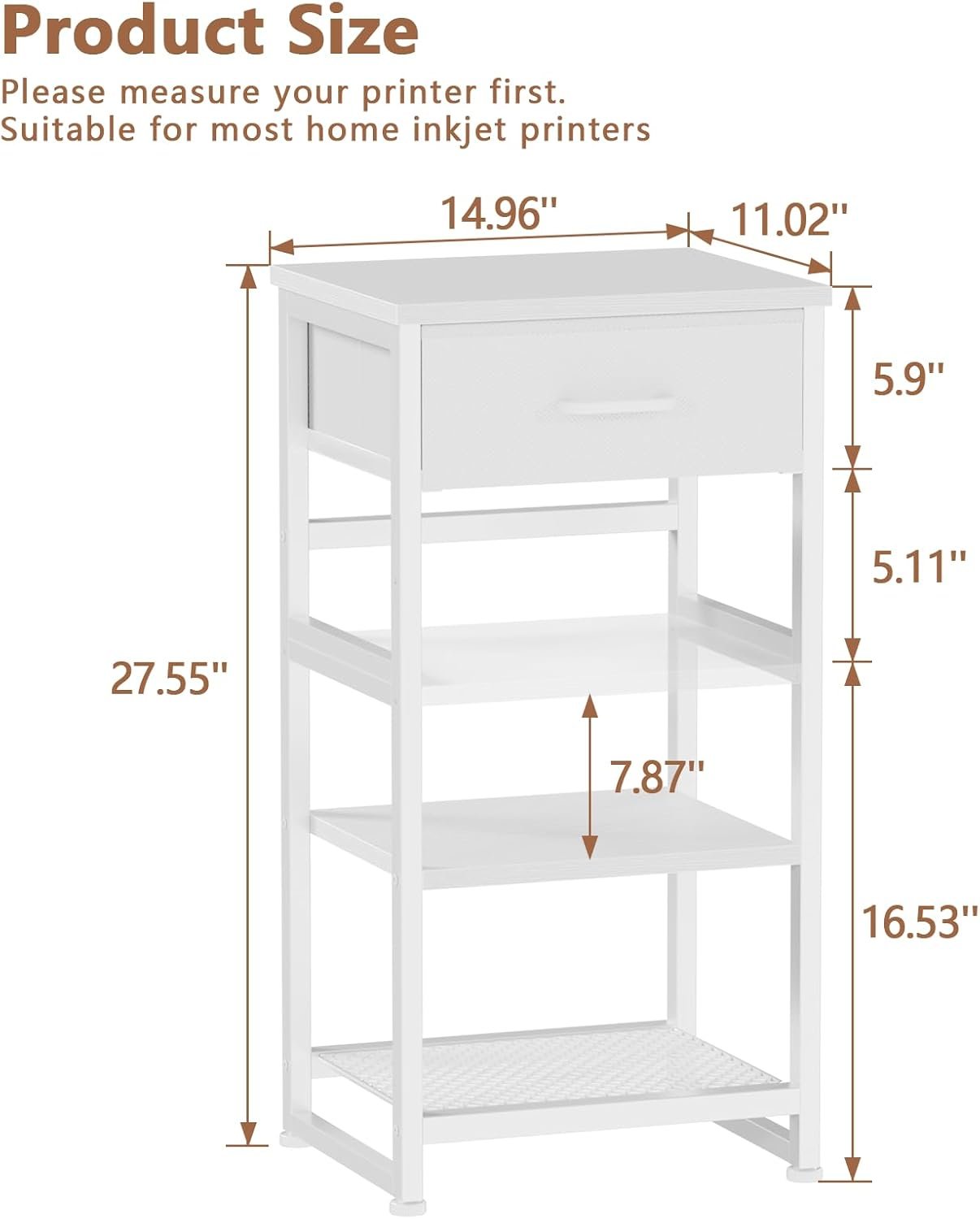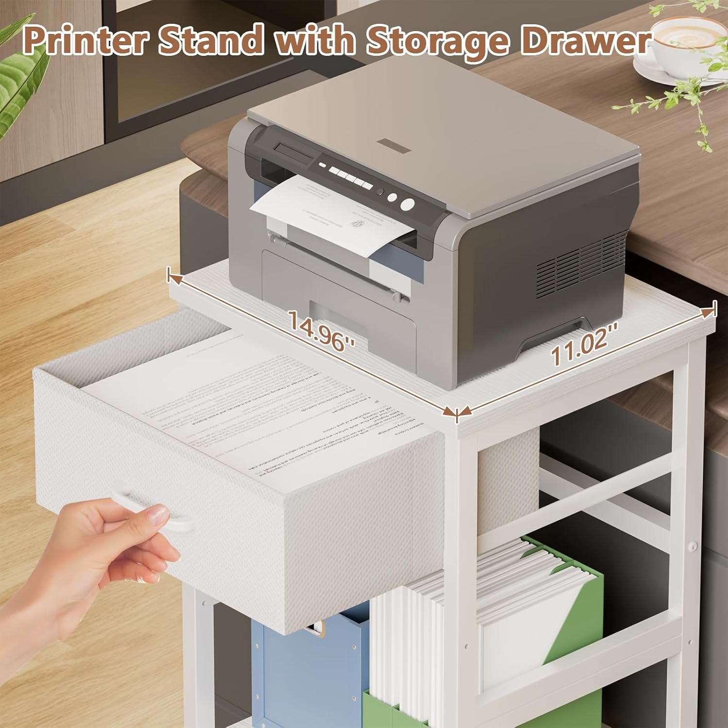 【Sturdy & Stable】The small printer stand made with drawer is made of high-quality metal and upgraded fabric drawers to ensure stability and durability, it won’t tilt easily. Its quality material ensures long-term use