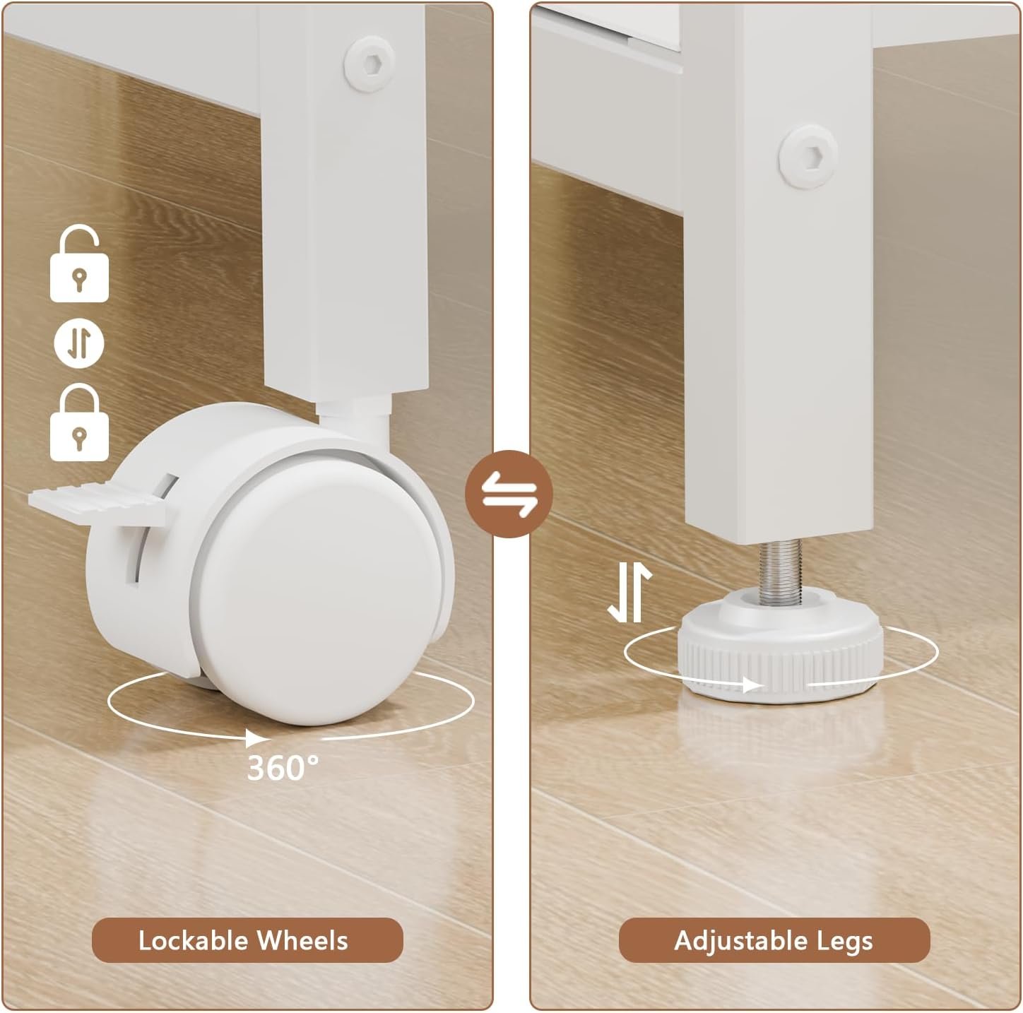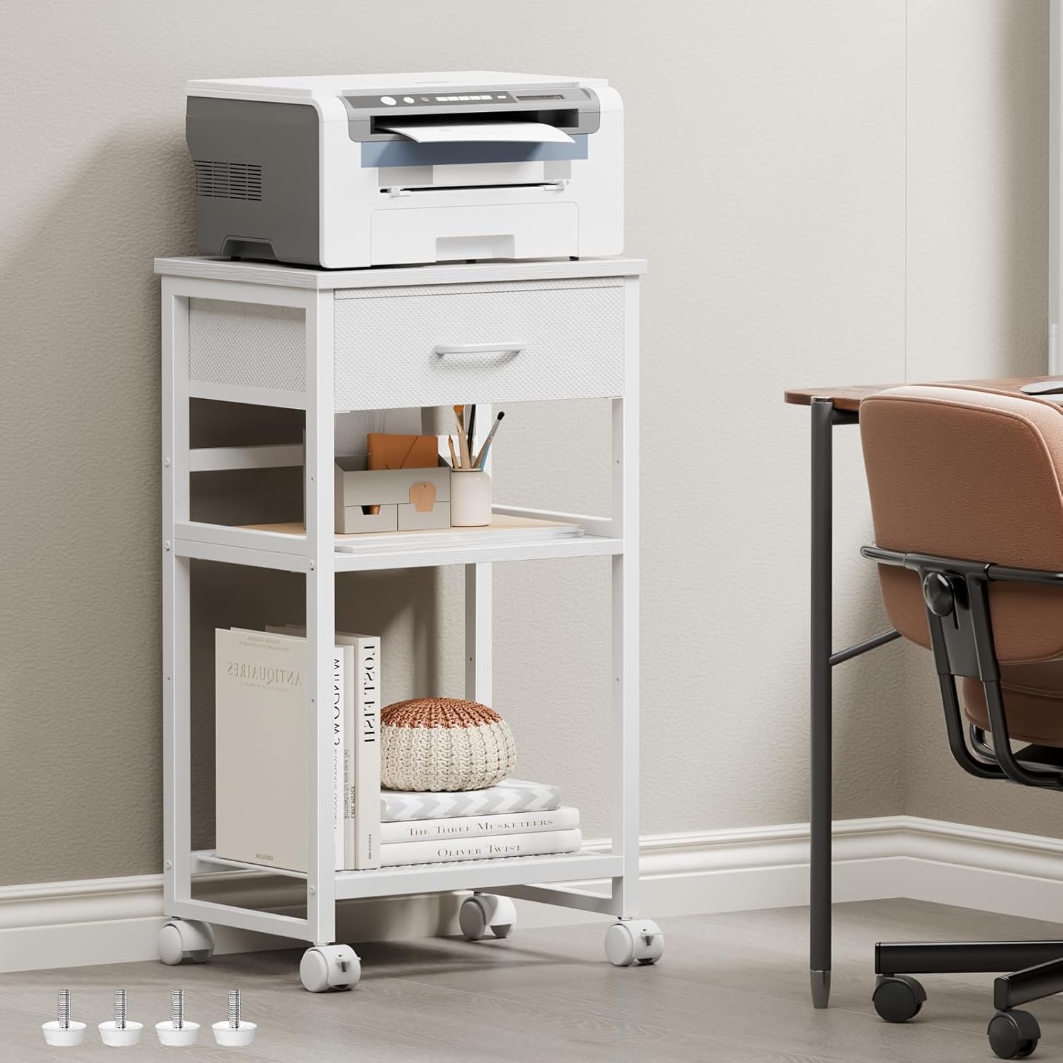 Four 360° swivel casters( two of which have brakes), allow you to effortlessly move this home printer stand and securely lock it in any position. Comes with 4 additional adjustable feet to install and use as you need.