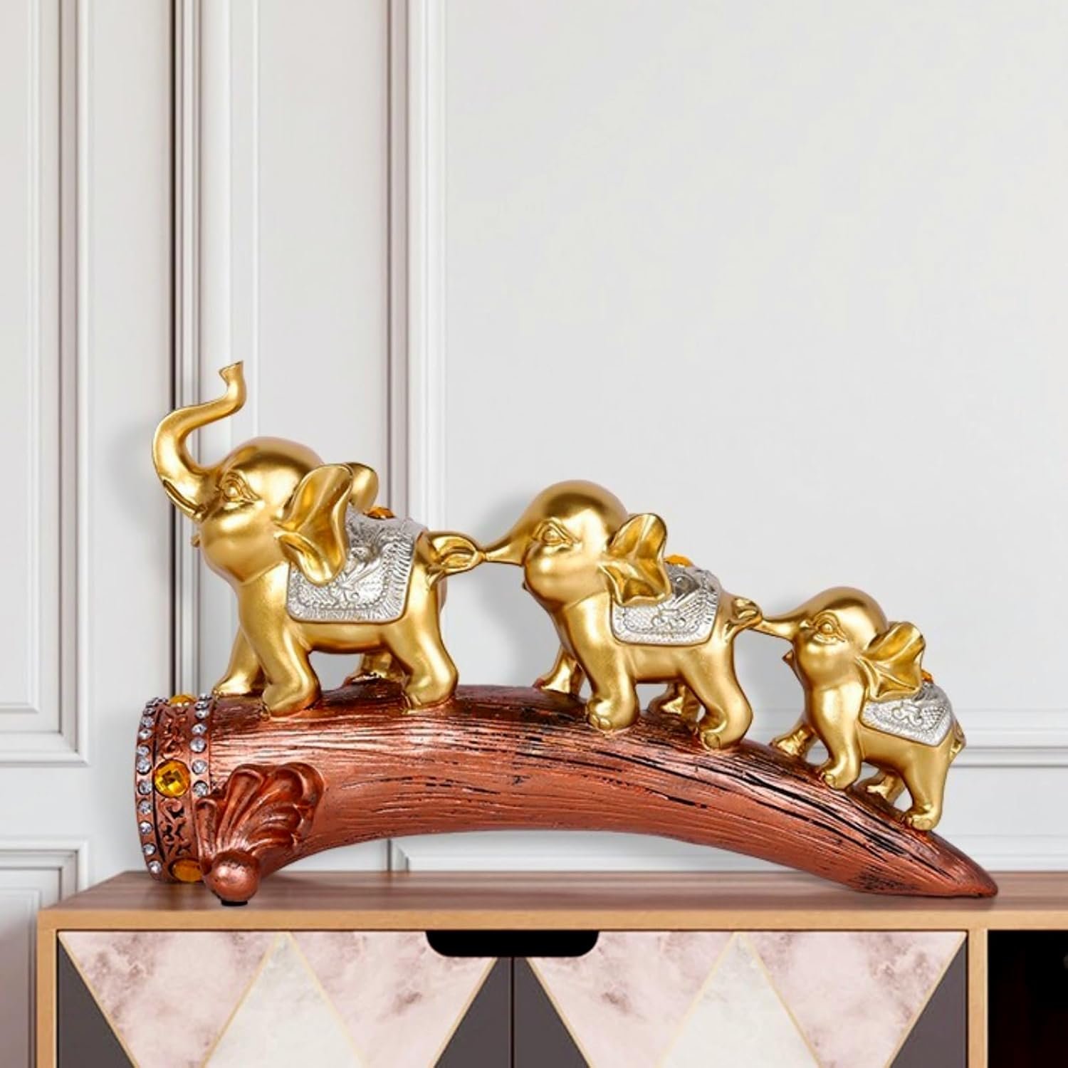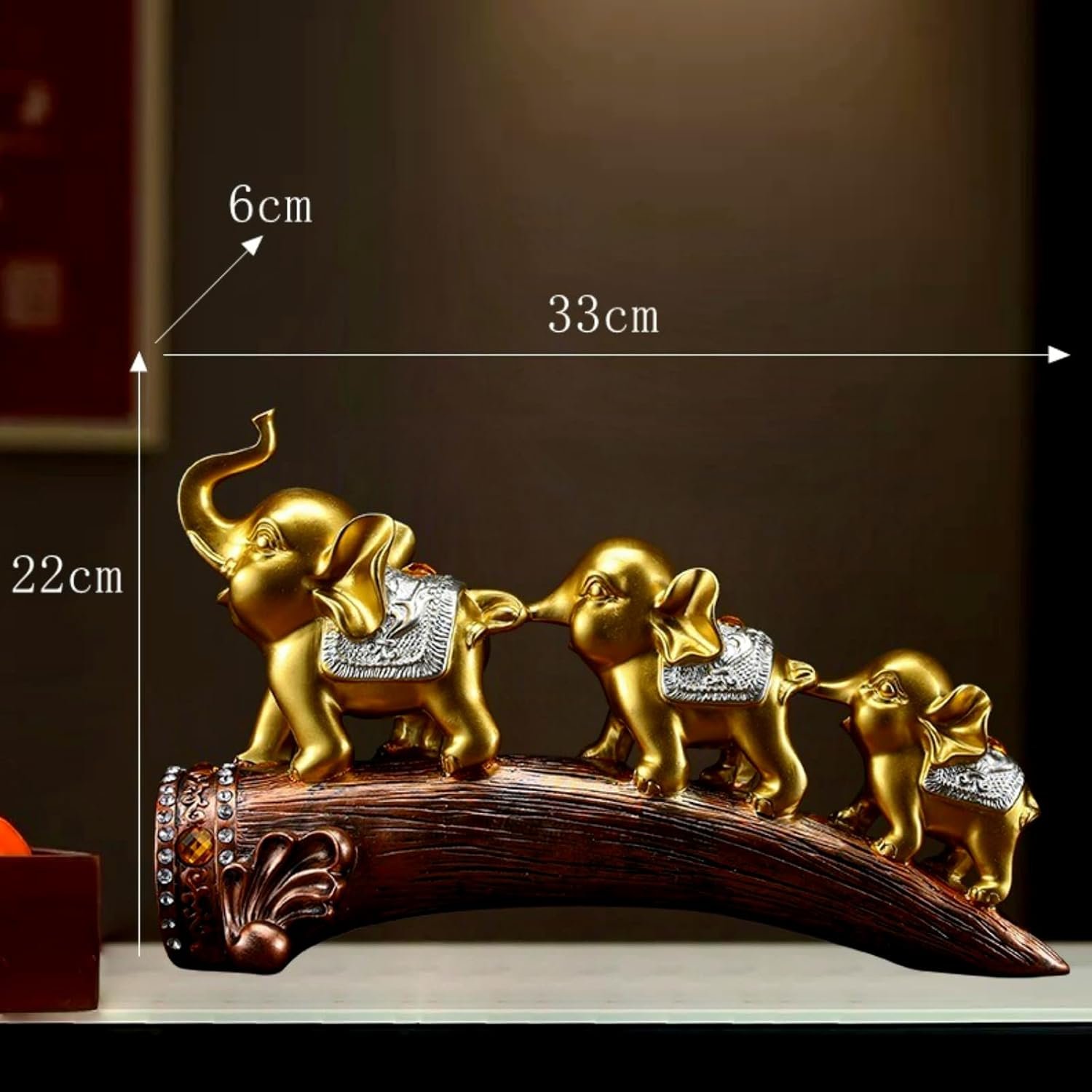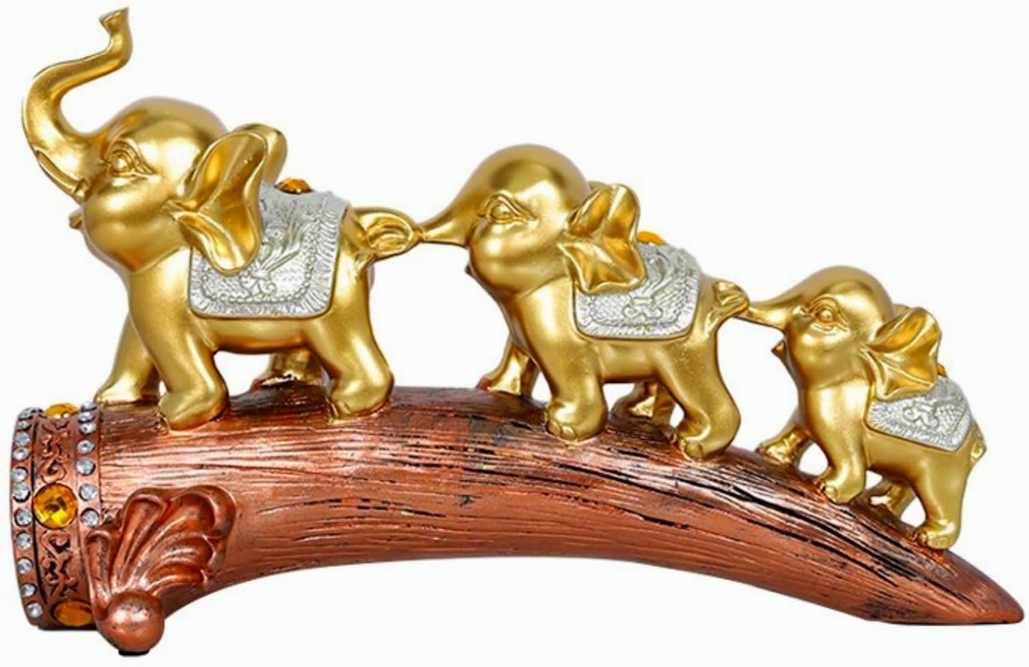Add a touch of majesty to your home decor with this stunning set of three elephant figurines. The elegant sculptures feature golden-hued elephants adorned with intricate silver glitter detailing, creating a luxurious and eye-catching display. Arranged in descending size on a curved base, the elephants appear to be walking in a graceful procession. The largest piece measures 13.39 inches in length and 6.5 inches in height, making it an impressive centerpiece for any table, shelf, or mantel. The resin construction ensures durability while maintaining the delicate details of each elephant’s features, from their uplifted trunks to their textured surfaces. Perfect for adding an exotic accent to your living room, office, or study, these decorative elephants symbolize wisdom, strength, and good fortune in many cultures. The combination of gold finish and sparkling silver accents allows these pieces to complement both traditional and contemporary decor styles.