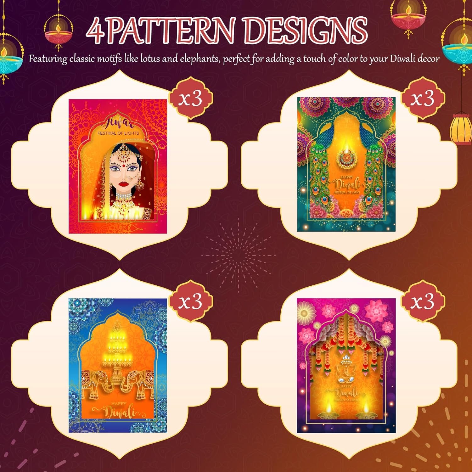 Candlestick Set: our set includes 12 Diwali candlesticks, 12 candle LED lights, and 12 double sided tape; The candlesticks come in four colors: red, purple, green, and blue; They come in a variety of beautiful patterns, including classic motifs like lotus and elephant, making them perfect for Diwali parties and weddings