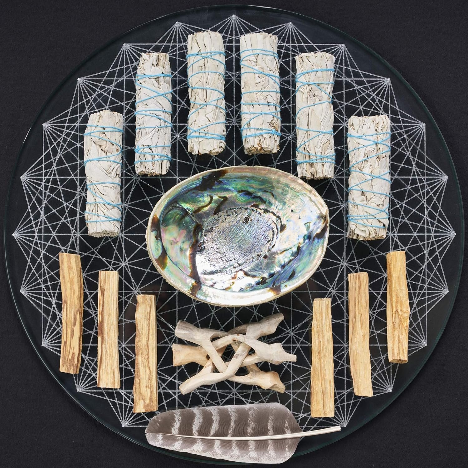 6 white sage smudge sticks (4 inch each)6 palo santo sticks (4 inch)1 abalone shell (5.5 to 6 inches wide)1 wooden tripod stand (4 inch + hand-carved)1 smudging feather (8 inch)Easy step-by-step instructions & blessingsClean & stylish packaging ready for delivery