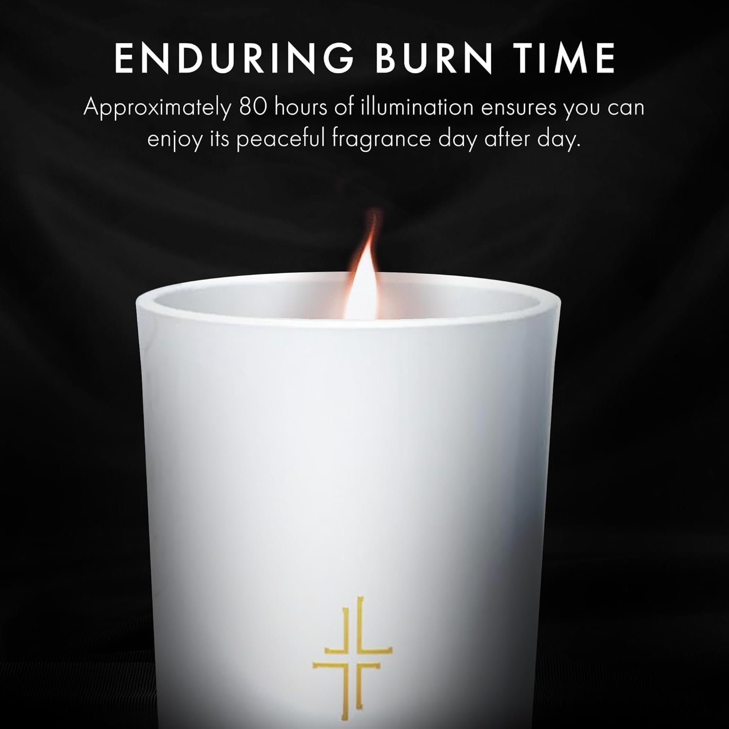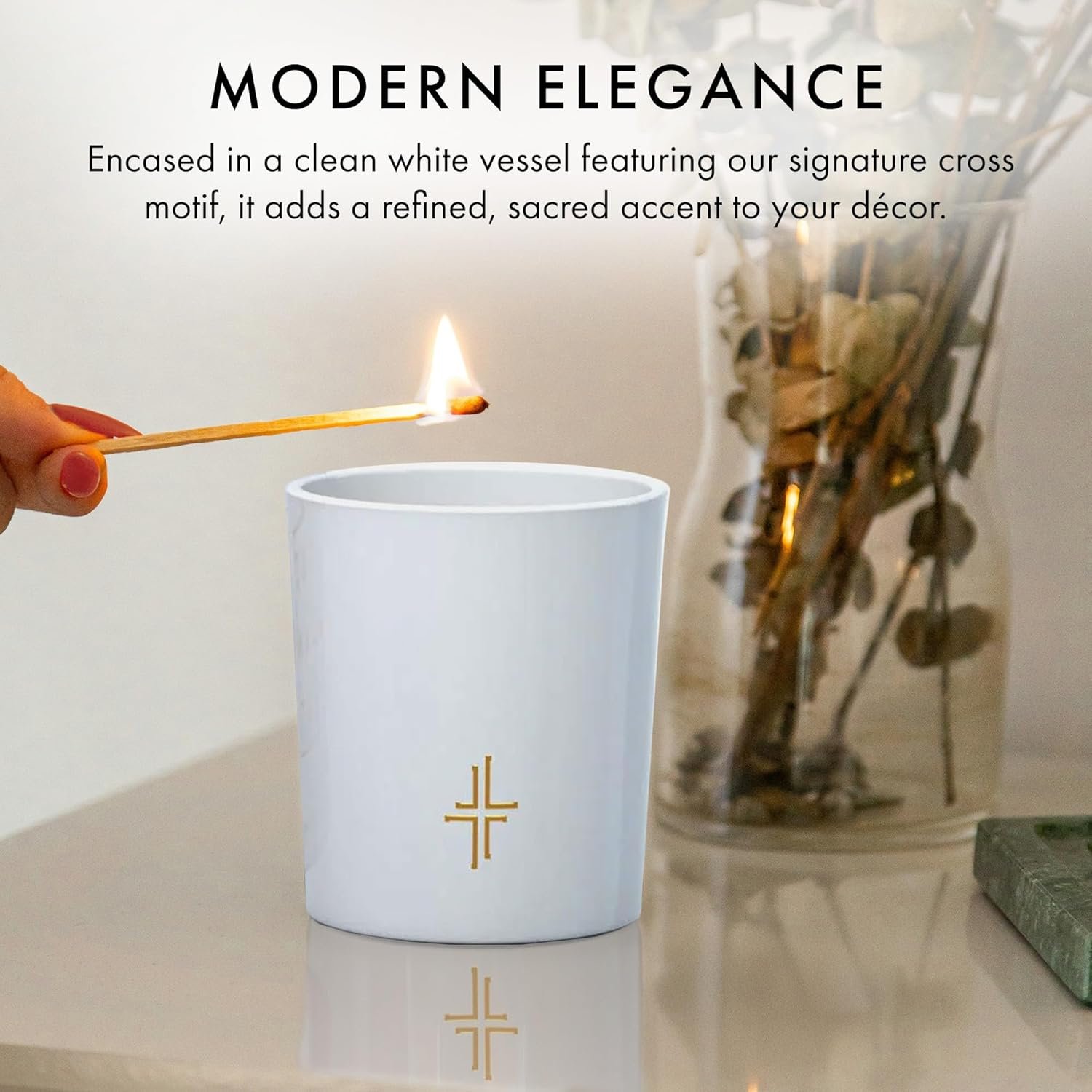 Refined Aesthetic: Housed in a clean white vessel adorned with our signature cross motif, this decorative aromatherapy candle adds a refined, sacred accent that effortlessly complements modern and classic decor
