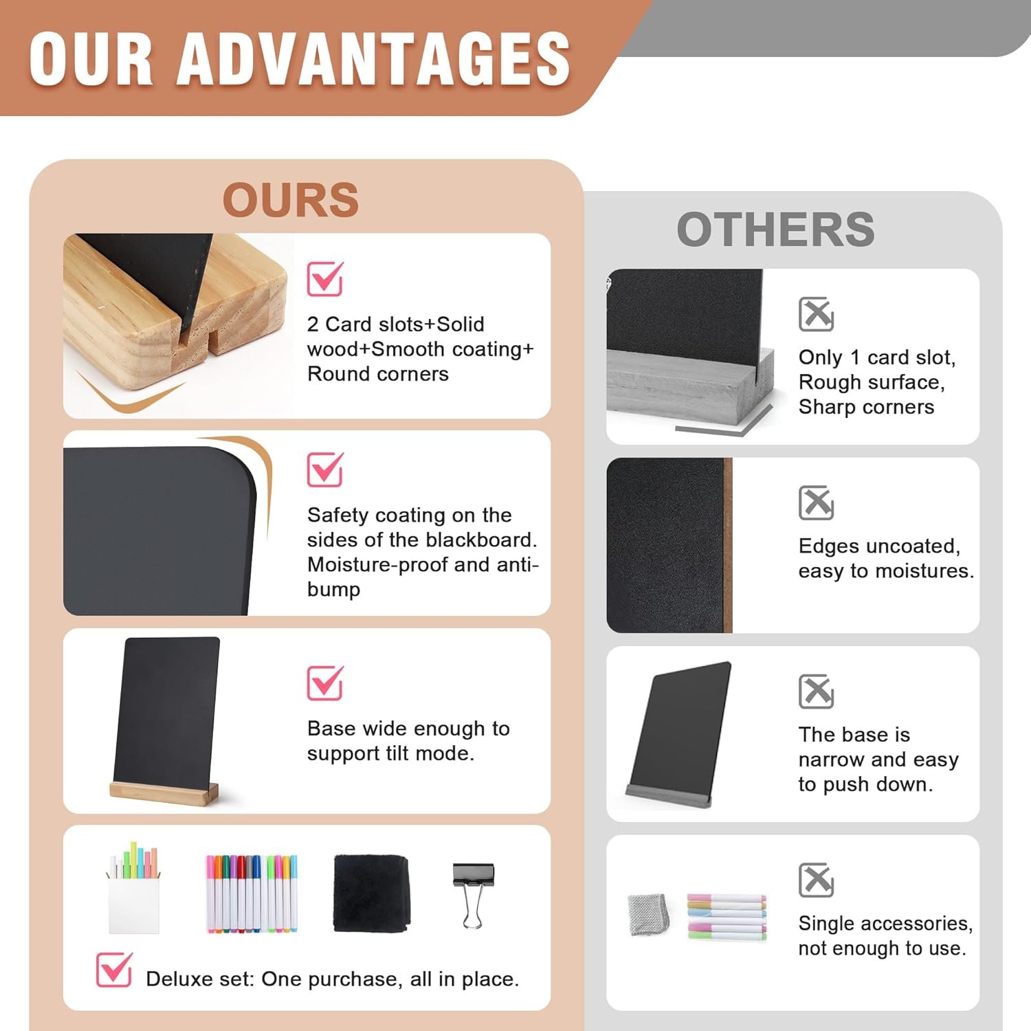 💯【100% SOLID WOOD BASE & THICK BOARD】 The base is made of pine wood and each one is hand sanded, safely coated and kept smooth and burr free; The chalkboard is made of 0.12 inch thick MDF, and all four sides are safety coated to keep moisture and collision resistant.
