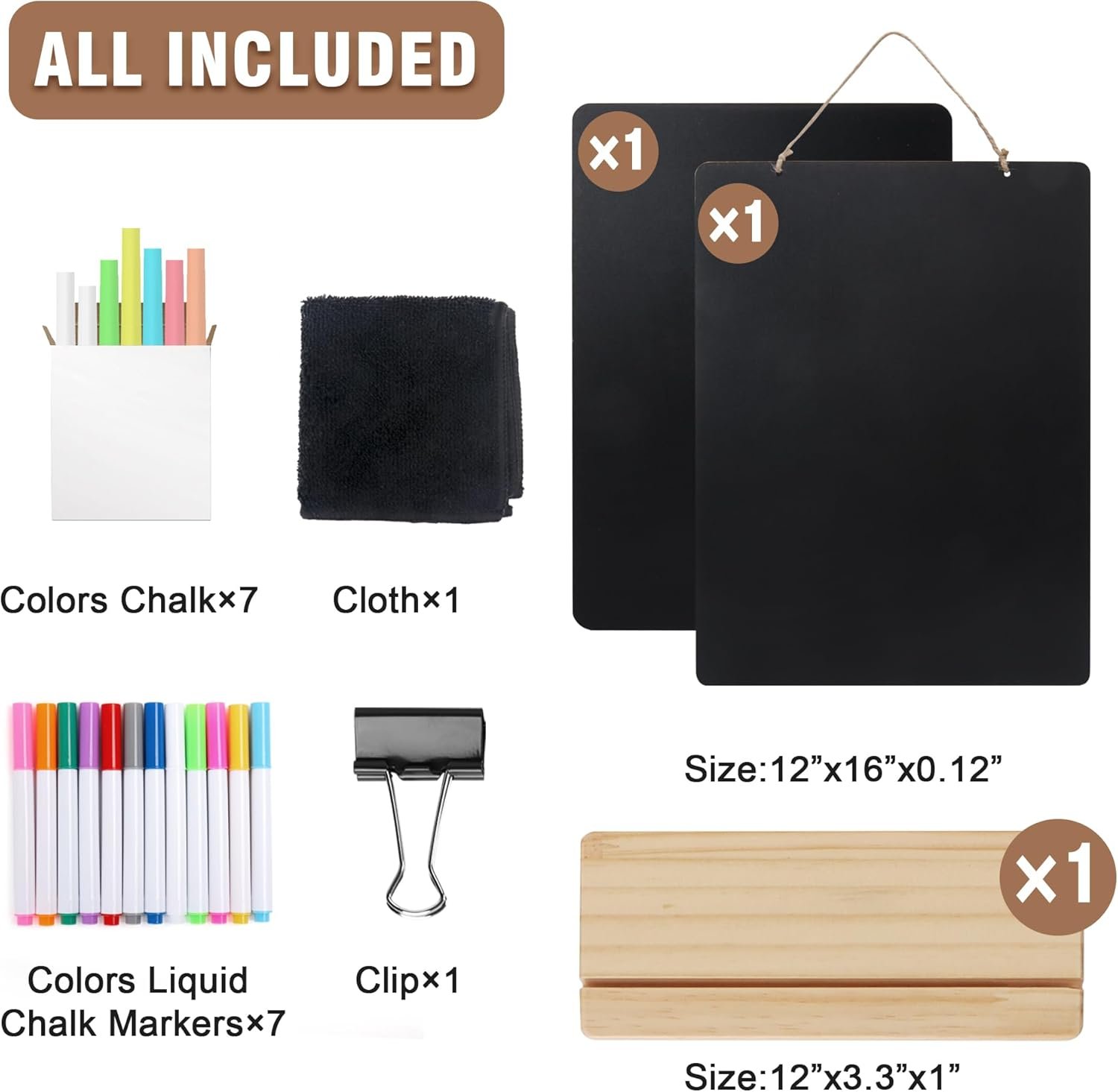 🌈【ALL INCLUDED】 2 Pack 12” x 16” Chalkboard Signs: 2pcs Chalkboards + 1pc Wood Base + 12pcs Liquid Chalk Markers + 7pcs chalk + 1pc Black Cloth + 1pc Clip. One purchase, all in place!