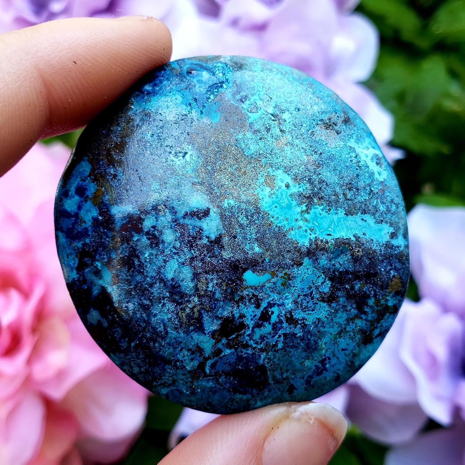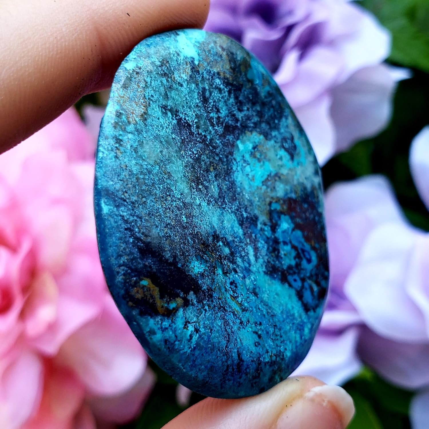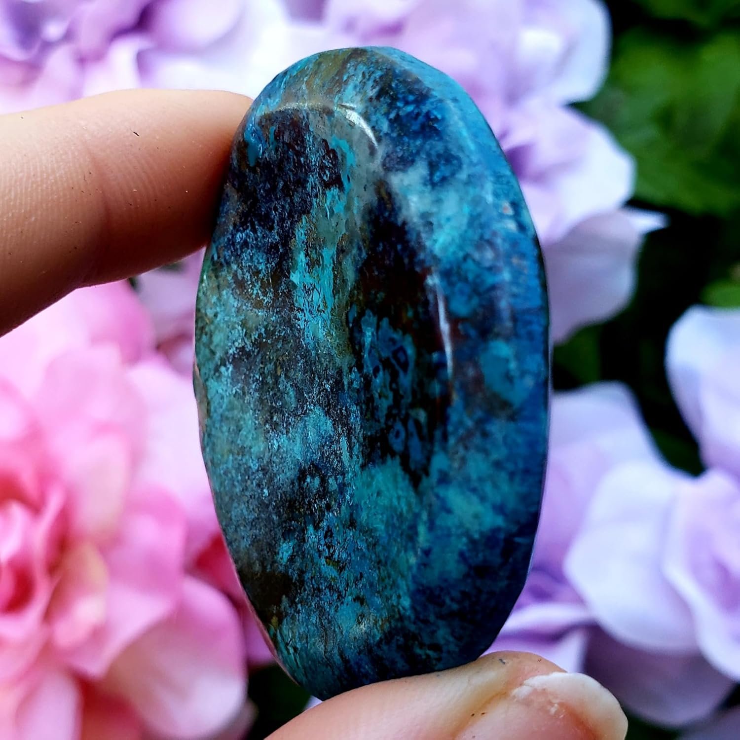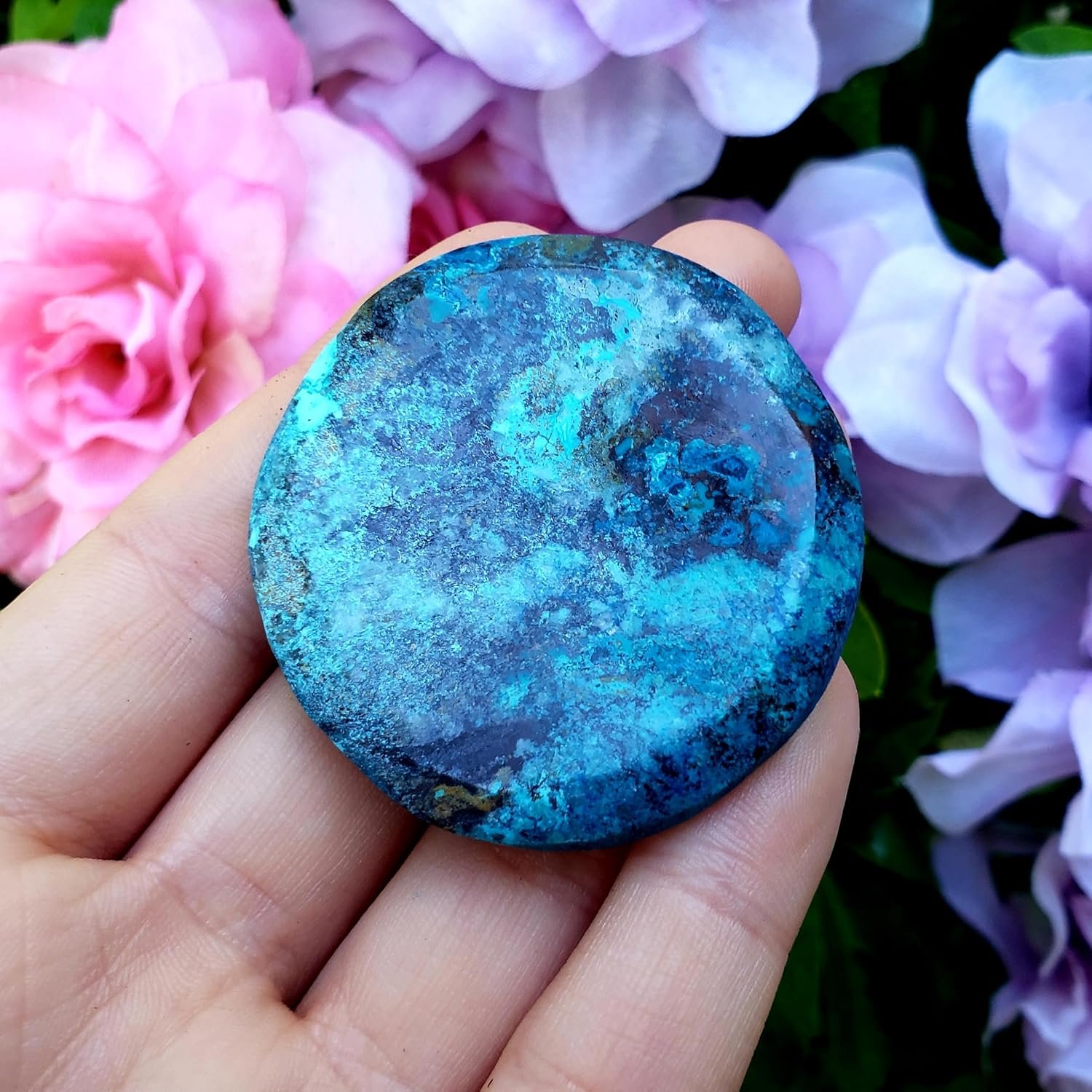Shattuckite Polished worry stone with thumb rubbing dip Natural Healing Crystal Gemstone Specimen Stone -……….you get this exact 1 of a kind piece……………*Some pieces may include a little Turquoise , chyrysocolla , or malachite stone…………Shattuckite is a stone of intuition, mediumship, and psychic abilities. This copper silicate offers up clarity of the mind, heart, and throat, creating an ever strong connection that allows one speak the highest truths………….Shattuckite is a spiritual stone that can connect you with your higher self and past lives. It helps connect you with spirit guides and universal wisdom. It is considered an excellent energy conduit, it reaches a high vibration, insisting that the purest source is contacted