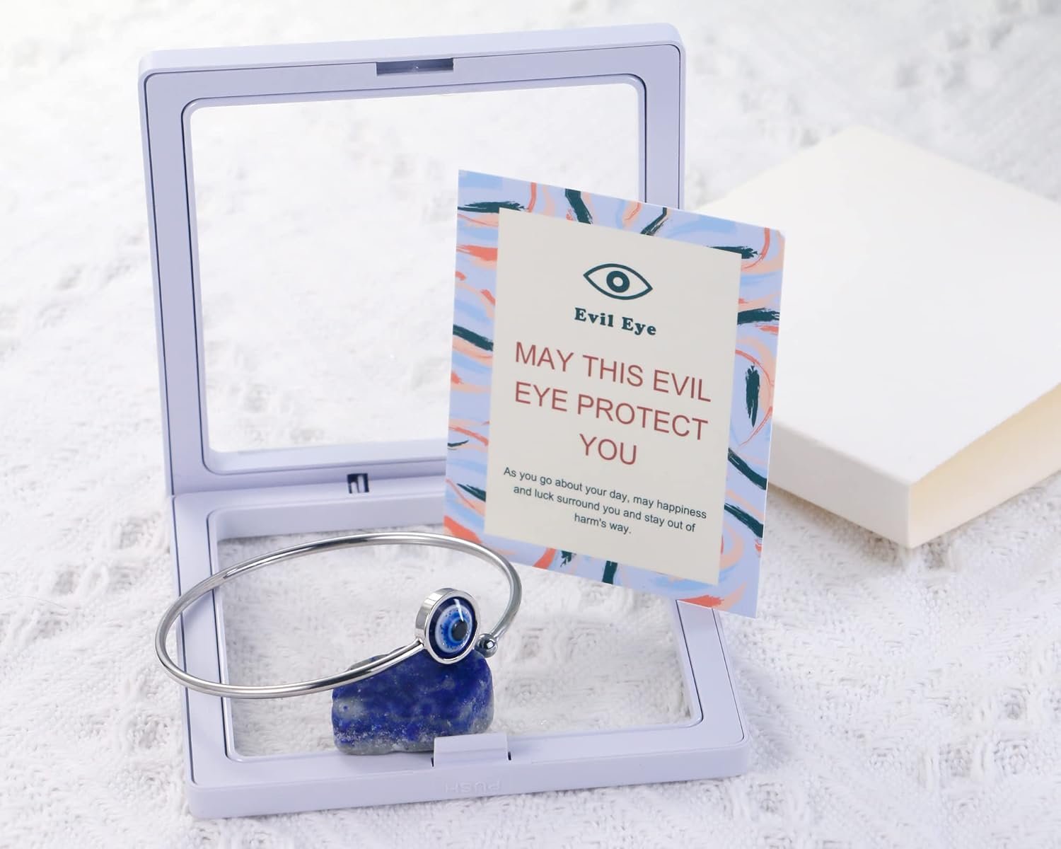 The blue eye bracelet comes with a well-protected package and a polish cloth is included to take care of the jewelry.