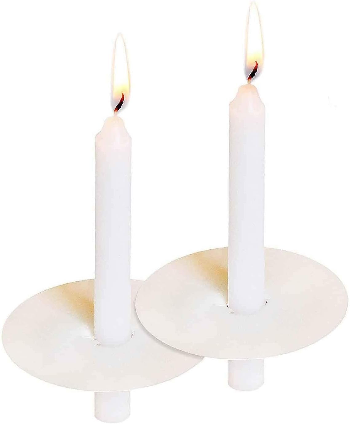 Slim stick candles smooth great-looking white unscented; Drip protectors are made of heavy duty paper that prevents bending and spillage and have a shiny white finish on both sides.