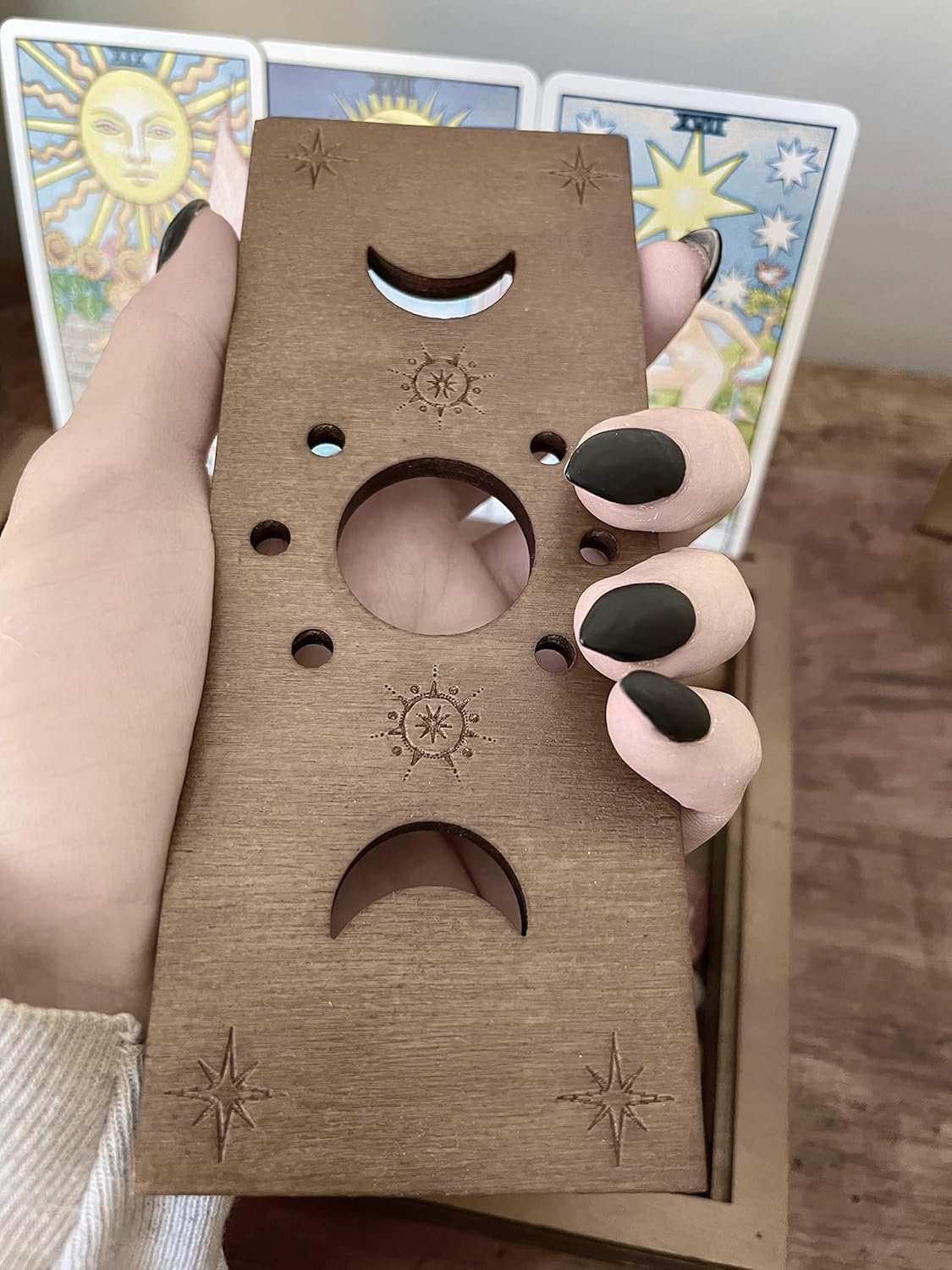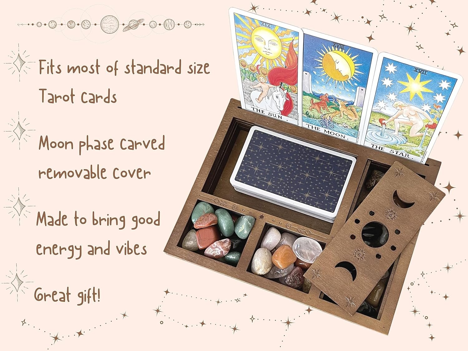 LIGHTWEIGHT, PORTABLE, BUILT TO LAST – Compact and easy to move from room to room in your house, dorm, or office space. Lightweight and portable, our aesthetic boho wooden box is designed for those who collect and read cards on the go, or need a safe place to store their altar supplies crystals and accessories.