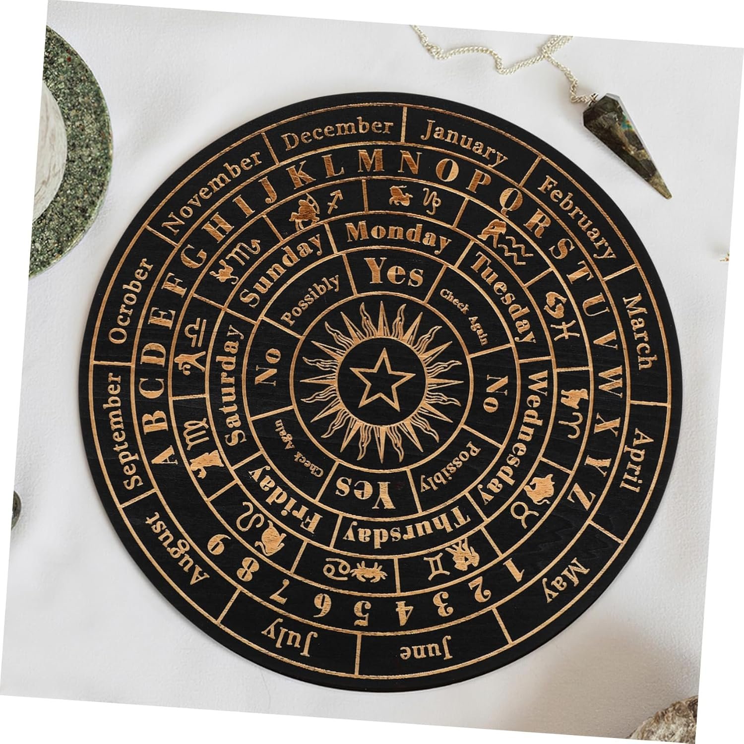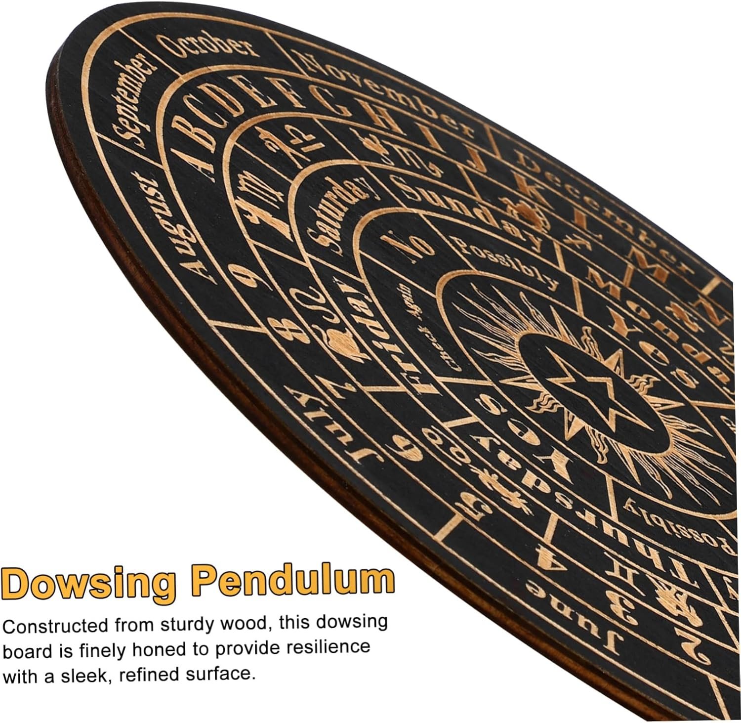wood divination boards Its smooth surface and natural finish make it a home decor for various settings.pendulum chart board Made from wood and carefully carved, this board features an elegant design with clearly marked sections for answers, weeks, months and other elements.spiritual decor If you are interested in divination, take this beautifully crafted wooden pendulum board