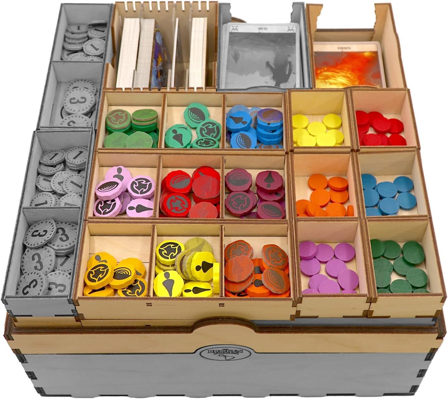 This organizer includes: 4 card trays 3 trays for single-turn effect markers 6 Player trays 7 new and redesigned token trays 1 map tile tray
