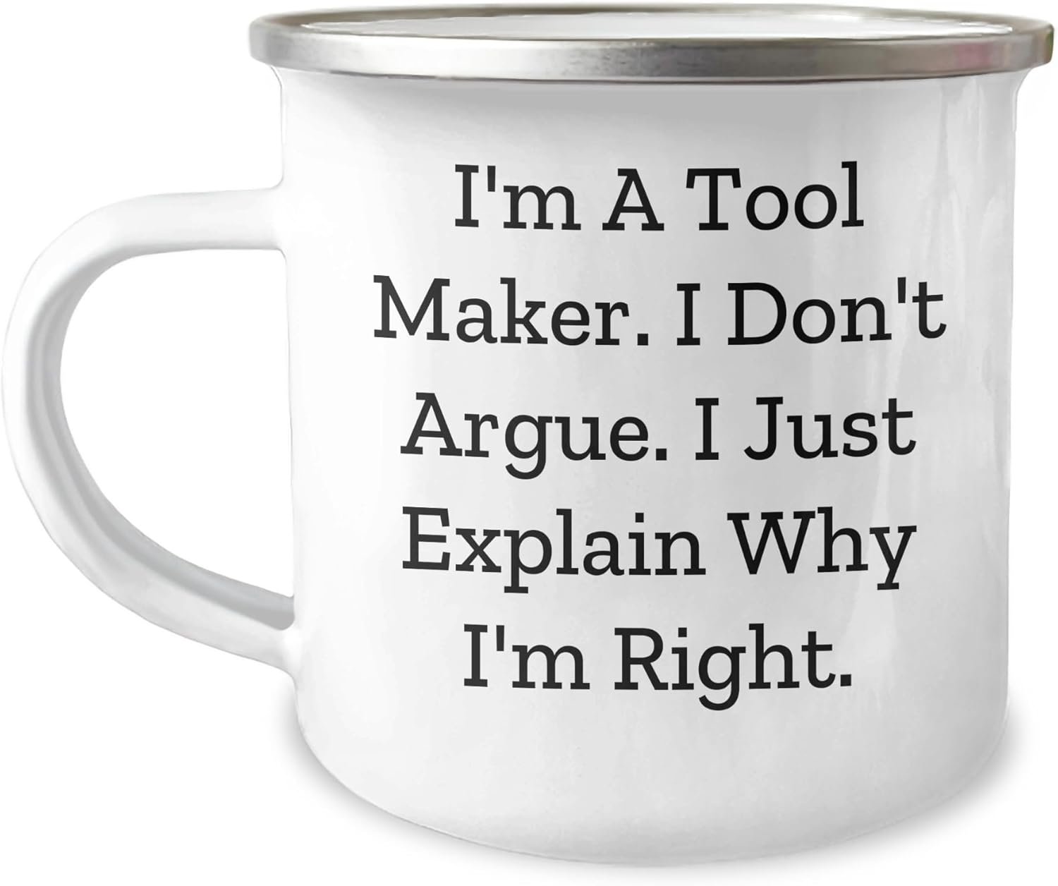 Surprise your Tool Maker friend with this funny and functional ‘I’m A Tool Maker. I Don’t Argue. I Just Explain Why I’m Right.’ Camping Mug, a ideal gift for graduation or any occasion.