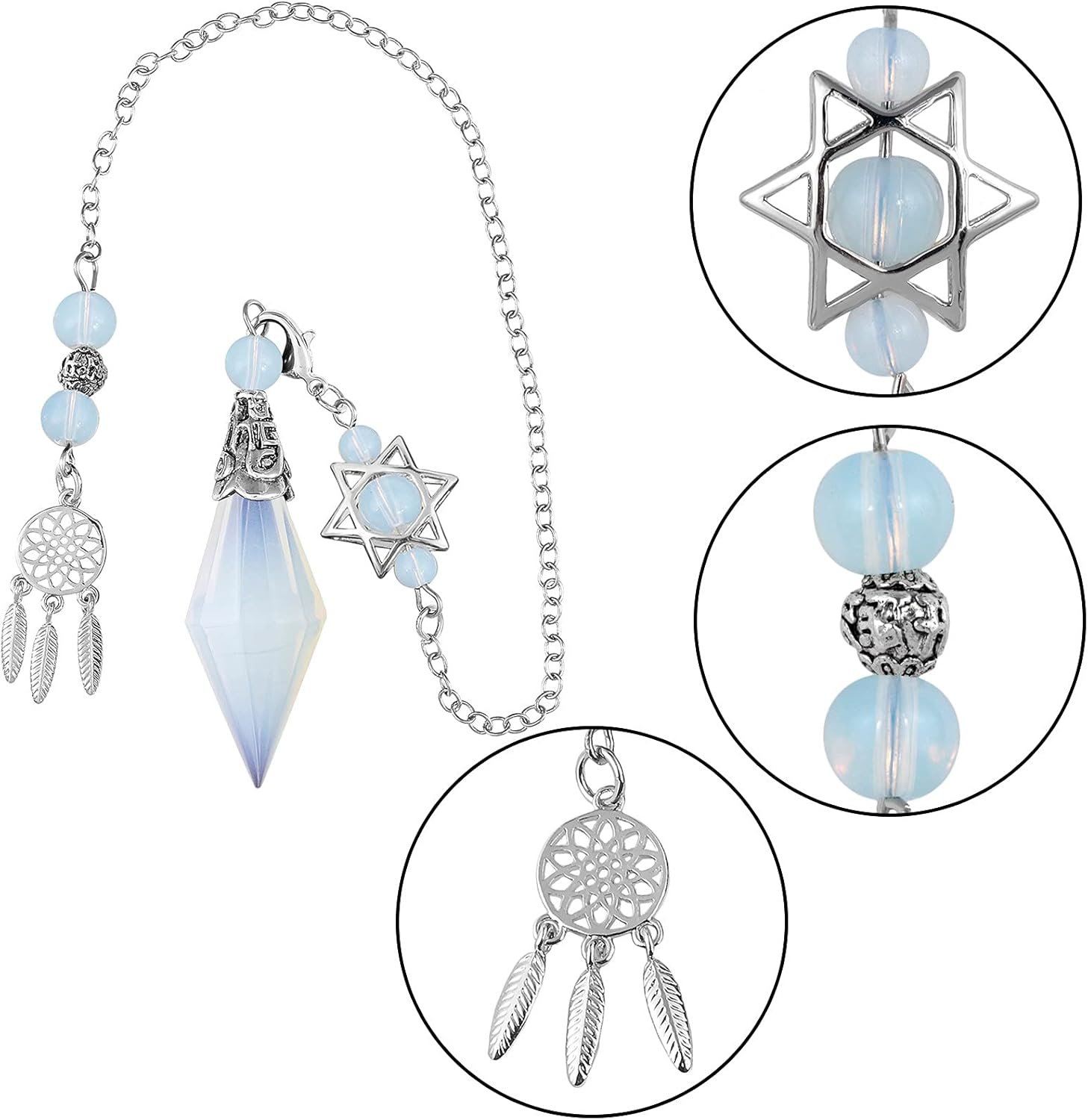 Faceted Point Pendulum: This Stone Pendulum beautifully crafted. Superb polishing process makes the crystal on each side smooth and bright. The top is inlaid with exquisite metal. The chain is also carefully designed, composed of crystal stone beads, Dream Catcher, and Merkaba Star. Each crystal stone is unique, please allow them to be slightly different from the picture shown in color, size, and texture.