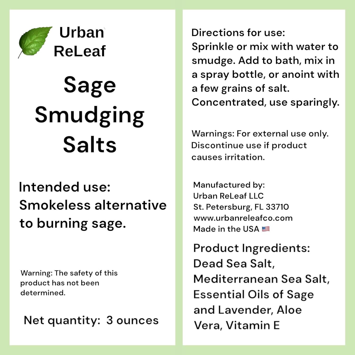 Urban ReLeaf Sage Smudging Salts Intended Use: Smokeless alternative to burning sage. Warning: The safety of this product has not been determined. Net wt: 3 ounces Directions: Sprinkle or mix with water to smudge. Add to bath, mix in a spray bottle, or anoint with a few grains of salt. Concentrated, use sparingly. Warnings: For external use only. Discontinue use if irritation develops. Manufactured by: Urban ReLeaf LLC, St. Petersburg, FL 33710. Made in the USA. Product Ingredients: Dead Sea Salt, Mediterranean Sea Salt, Essential Oils of Sage and Lavender, Aloe Vera, Vitamin E