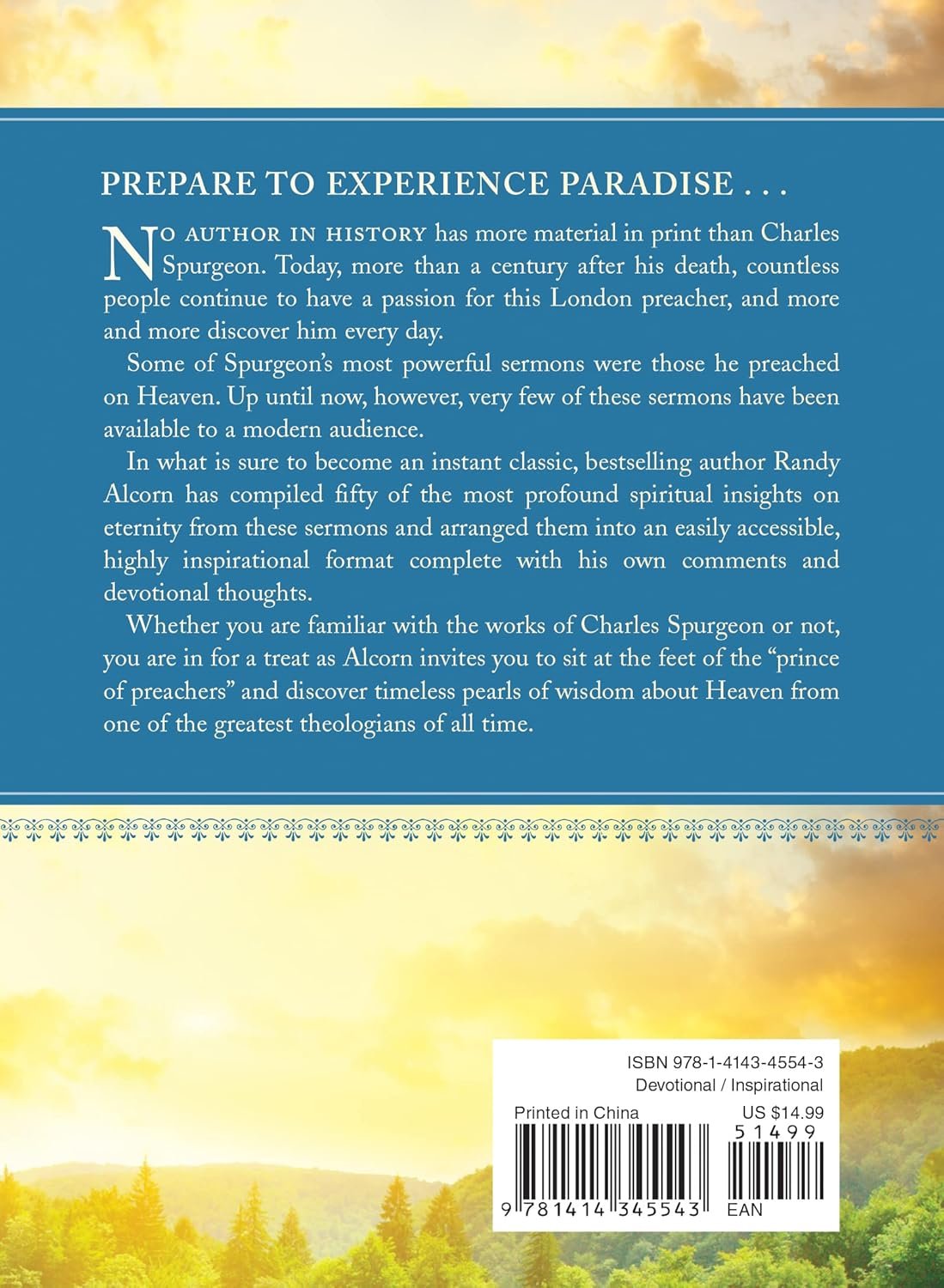 50 daily devotional meditations drawn from Charles Spurgeon’s sermons50 excerpts from Spurgeon’s sermonsEach day’s reading also includes comments and devotional insights from Randy AlcornGreat for personal reflection and small group studyA perfect gift for someone who has recently lost a loved oneToday, more than a century after Spurgeon’s death, countless people continue to have a passion for this London preacher, and more and more discover him every day.