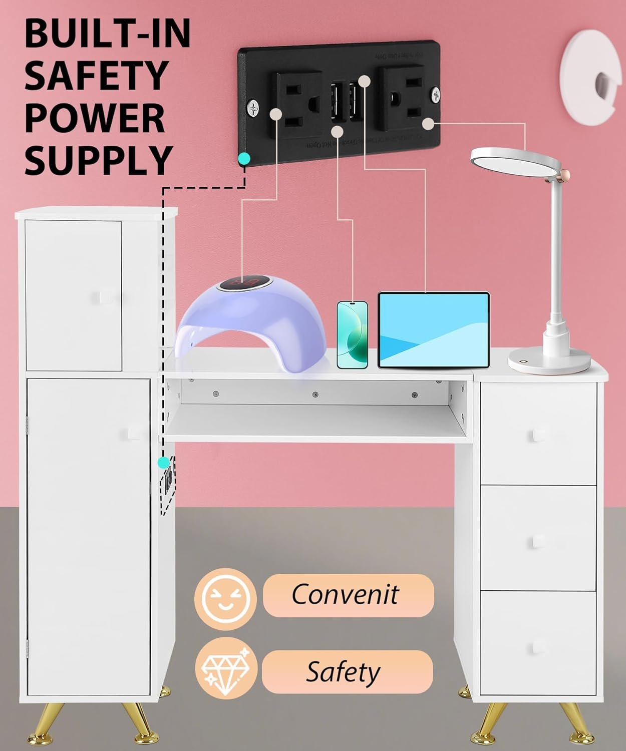Dual Hand Rests Included Built-In Power Supply 2 AC + 2 USB Rounded Corner Templates Left + Right Safety Corners Multi-Layer Storage System Cabinet + Drawers + Shelves Gold Legs + LED Strip Included