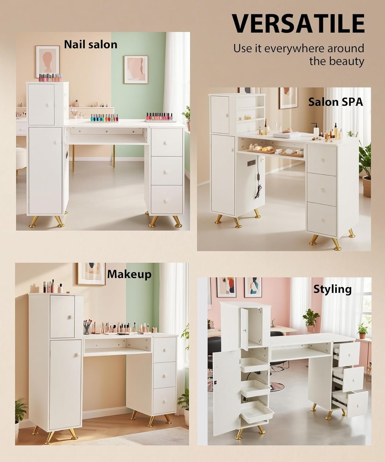 Ample Multi – Compartment Storage: Boast multiple cabinets and drawers for organized storage. The cabinets offer large – space storage for bulkier items like UV lamps or manicure kits, while the drawers are perfect for sorting nail polishes, tools, and small accessories. Keep your workspace tidy and find what you need quickly, enhancing your manicure efficiency.