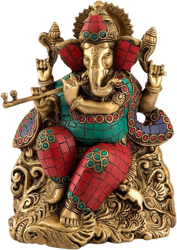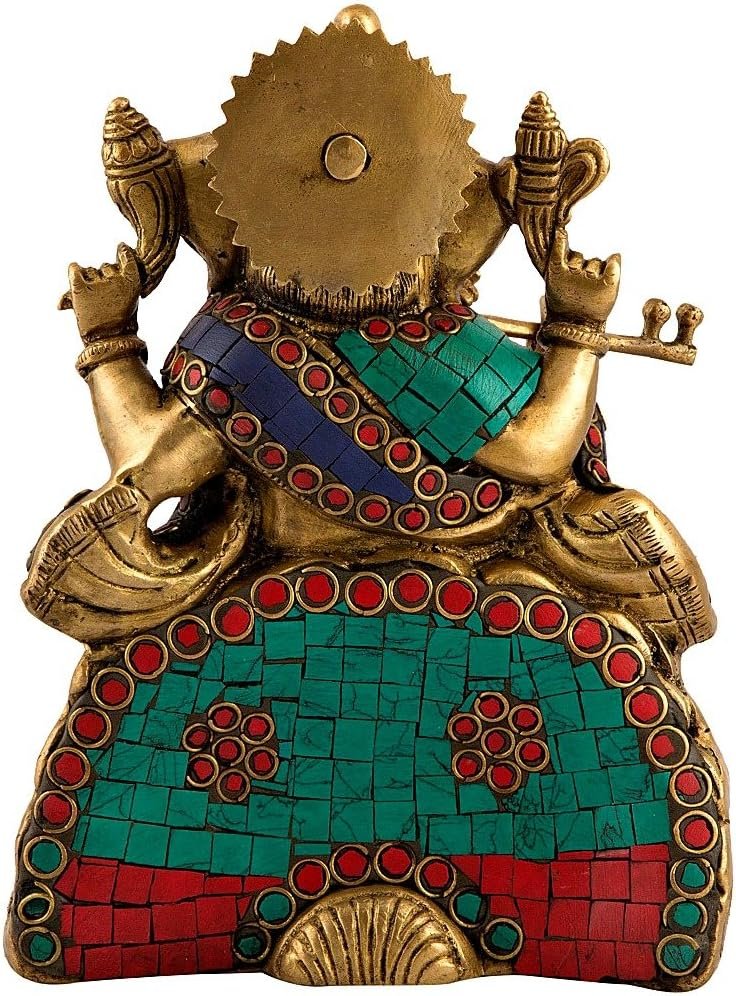 Gorgeous & Unique Artistic Ganesha Statue. Made of solid Brass Metal with colorful turquoise Gemstone hand work on body of God Ganesha /Ganesh playing bansuri (Flute). He is having crown on hs head. Lord Ganesha represents Joy and happiness which is symbolic to bring Prosperity and Good Luck. Look at his round tubby and snack around it which represents son of Lord Shiva. Size- 8 nches Height, 3 KG Heavy. This beautiful statue is of brass material with fine carving of Genuine Turquoise and some other precious stone. Don’t miss looking at all detailed hand carving around the ganesha sculpture. A relaxed & Jolly position of Ganesha. In his upper right hand Ganesha holds a goad, which helps him propel mankind forward on the eternal path and remove obstacles from the way. The noose in Ganesha’s left hand is a gentle implement to capture all difficulties. The broken tusk that Ganesha holds like a pen in his lower right hand is a symbol of sacrifice, which he broke for writing the Mahabharata. The rosary in his other hand suggests that the pursuit of knowledge should be continuous. The laddoo (sweet) he holds in his trunk indicates that one must discover the sweetness of the Atman.