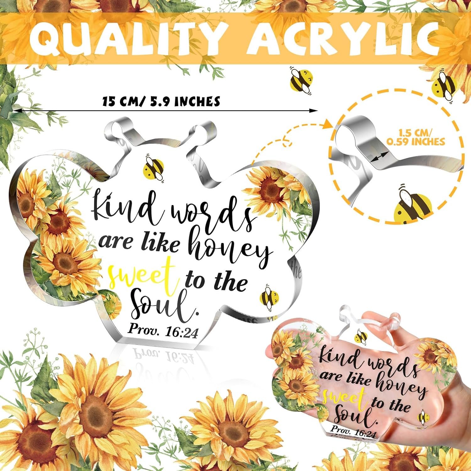 Suitable Size: you will receive a package with 1 piece of bee shaped sunflower Christian decorative sign, the size of the crystal bee decor is approx. 5.91 inches/ 15 cm long, and 0.59 inch/ 1.5 cm wide, which is firmly and easier to package or store, you can put it in the position you want without taking up too much space