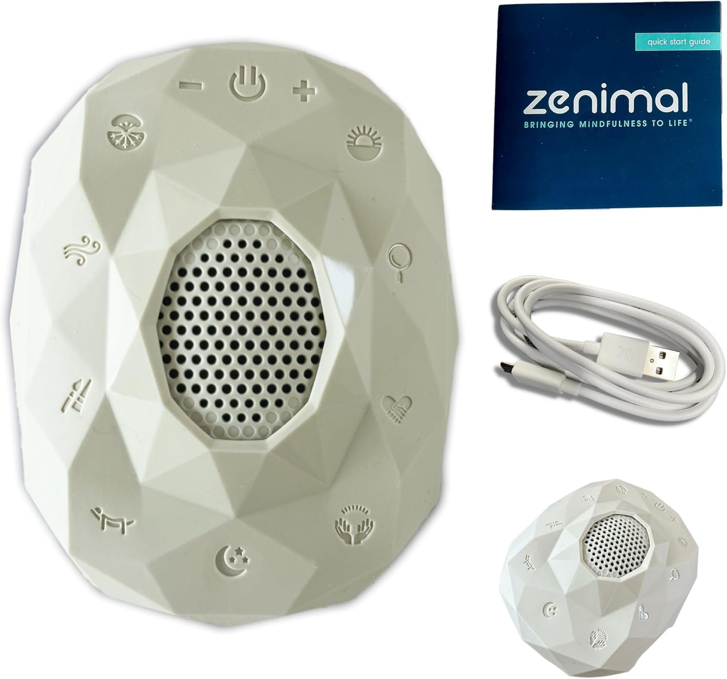 EVERYTHING YOU NEED TO GET YOUR OM ON: Our portable Zenimal Meditation and Sleep Machine comes with speaker and audio jack options, a rechargeable base unit, food grade removable silicone cover, and micro USB charging cord